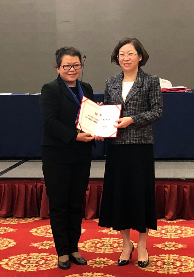 ▲中华中医药学会儿科分会主任委员熊磊教授为刘景萍董事长颁发聘书