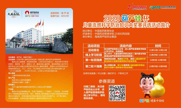 据世界卫生组织WHO统计,每年有5%~10%的成年人、20%~30%的儿童罹患流感,有300万~500万重症患者,造成25万~50万人死亡,儿童是流感的高发人群及重症病例的高危人群。尤其是在当下全球疫情肆虐之季,新冠防控工作依然不容放松,流感防治知识科普显得尤为重要。儿童是祖国的希望,民族的未来,关爱儿童健康成长是时代赋予ga黄金甲·(中国区)官方网站的历史使命,为了能帮助更多的儿童科学防治流感、科学预防新冠肺炎,ga黄金甲药业集团携手中国医药教育协会药店管理专业委员会(药店管理学院)和21世纪药店报特举办本次儿童流感科学防治知识大奖赛。